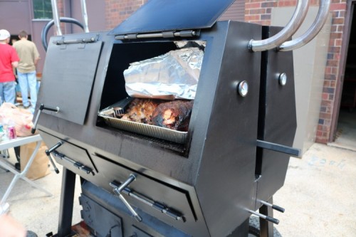 The grill/smoker features two separate compartments on each side where meat (or veggies) can be smoked or grilled. Built with wheels and a tow hitch, this grill/smoker is sure to be a hit wherever it makes a stop.
