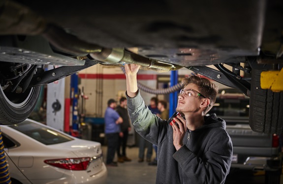 Students working on car in WCTC Automotive Lab